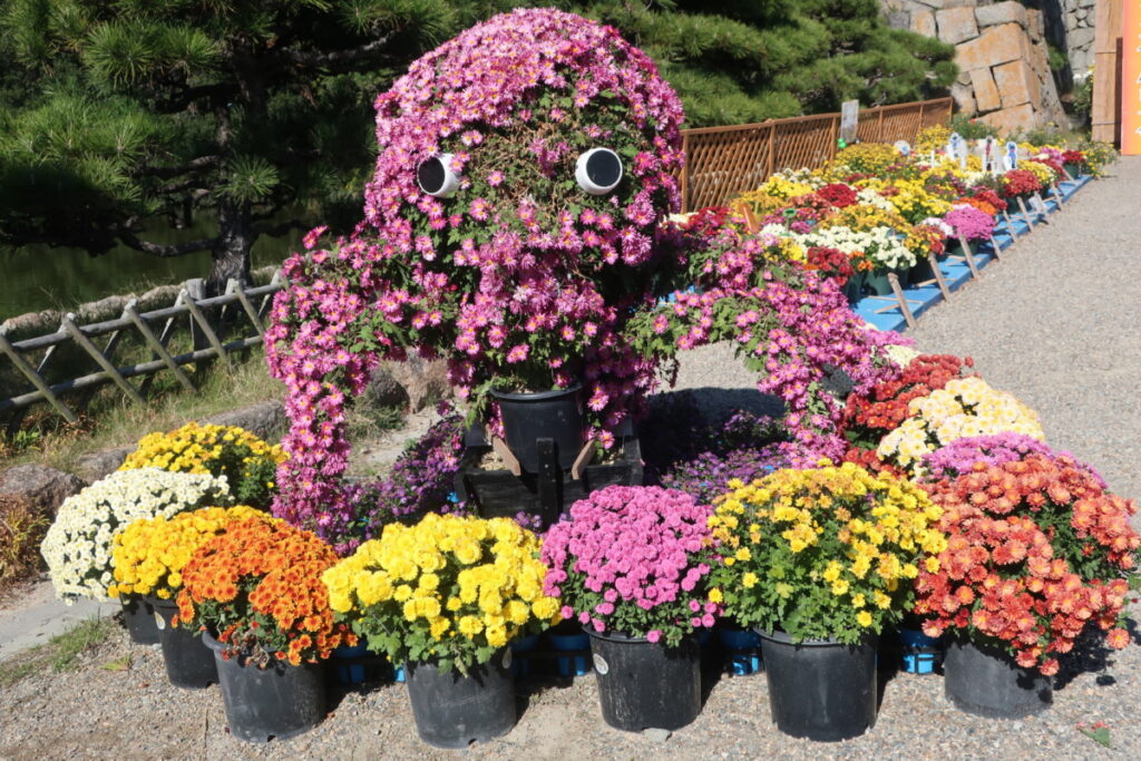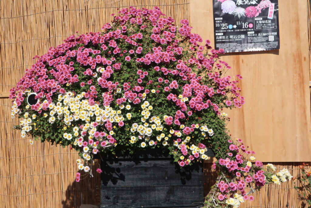 生き物や人物などを型どった骨組みに、菊花をはわせて造られたものです。