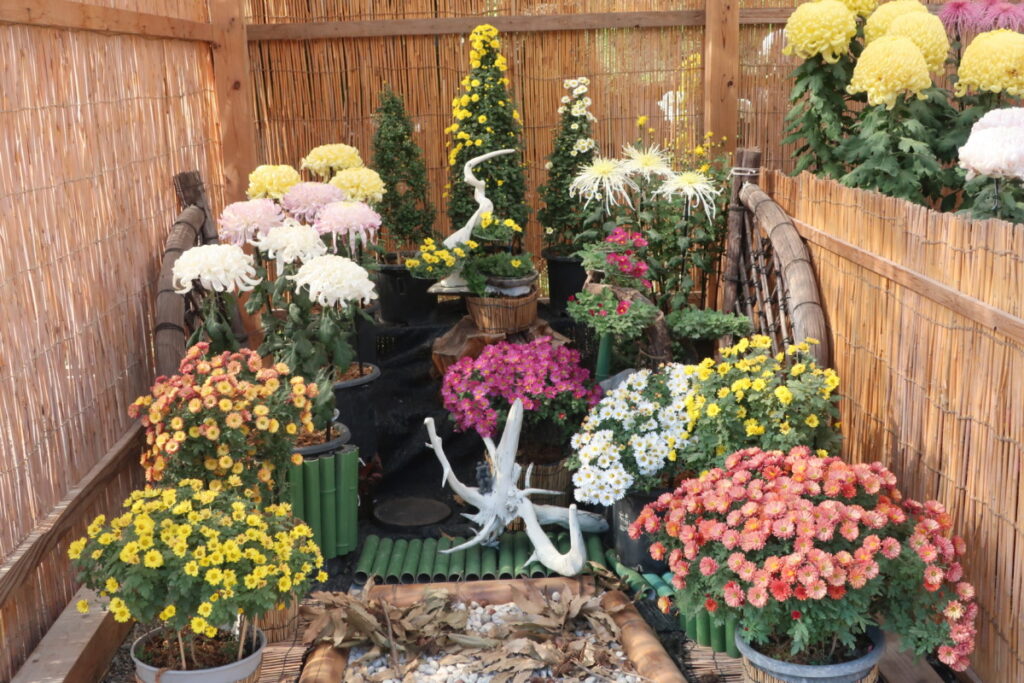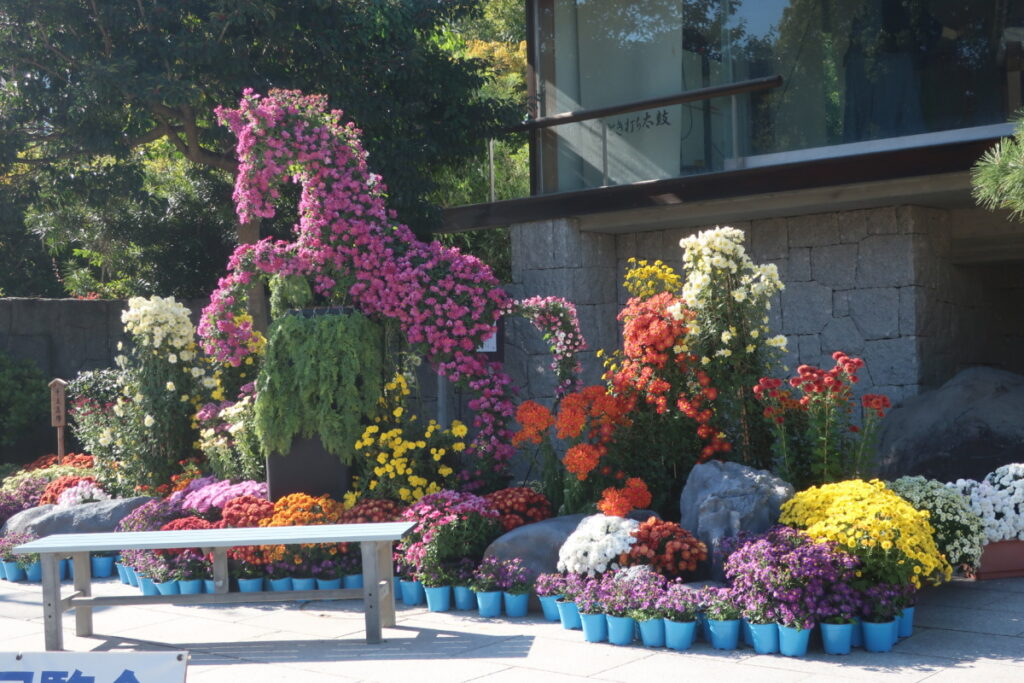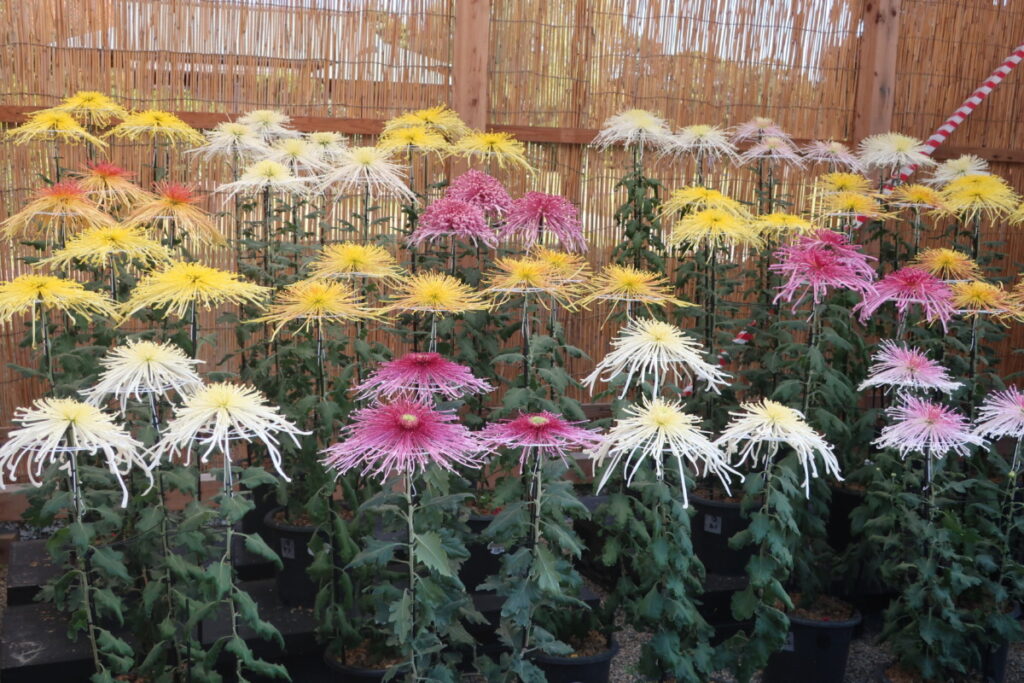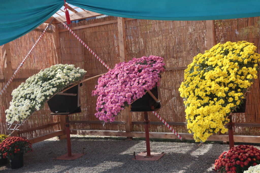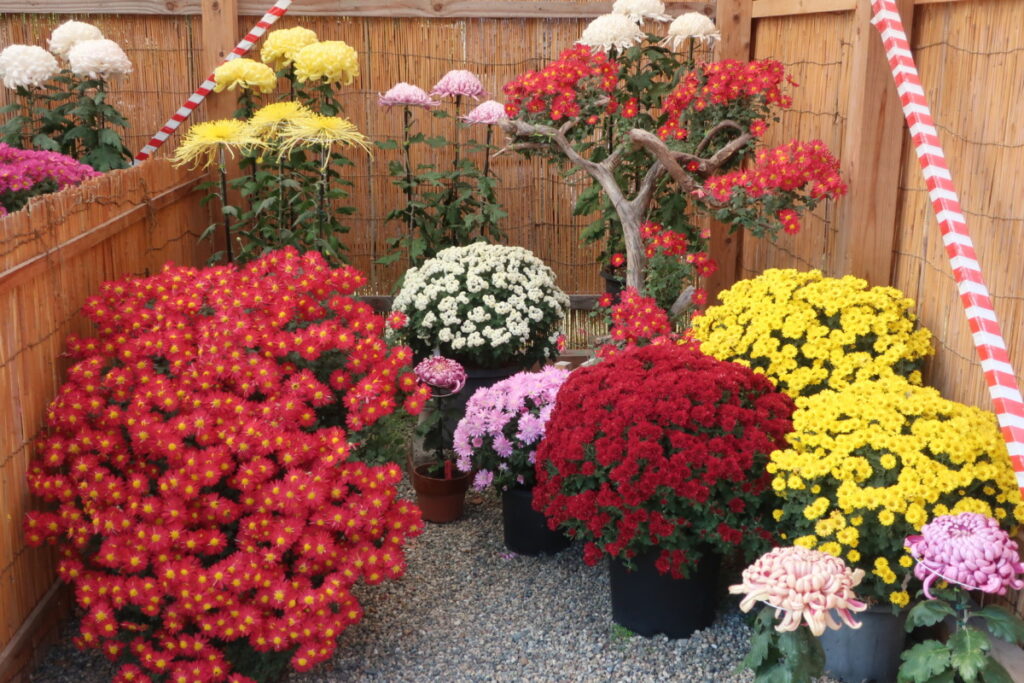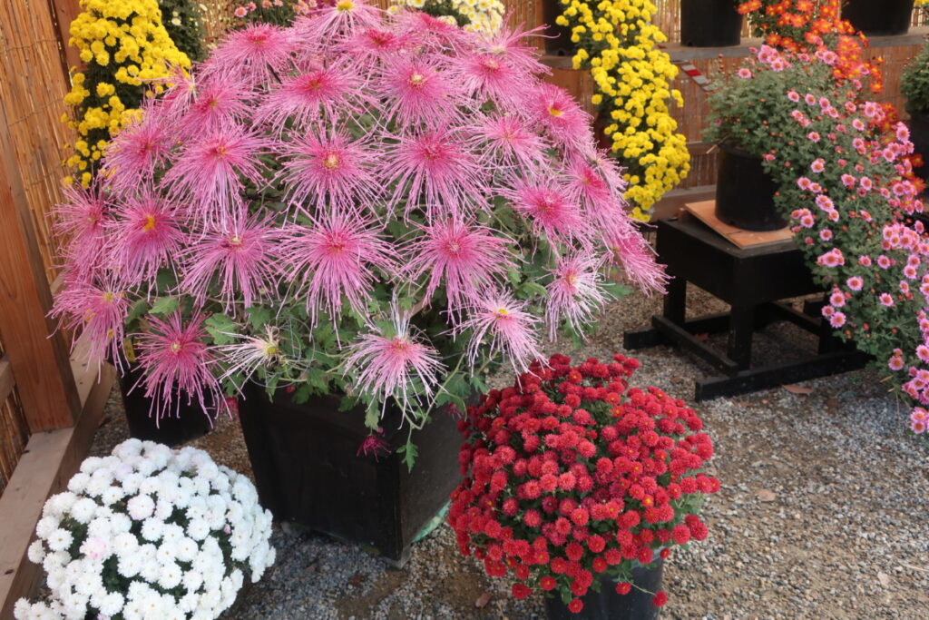 菊の展覧会は、見ごたえのある花壇や鉢がいっぱいです。