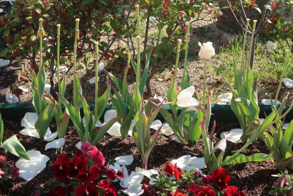 チューリップの花は、およそ一週間で散ってしまい、上の画像のように葉と茎だけが残ります。